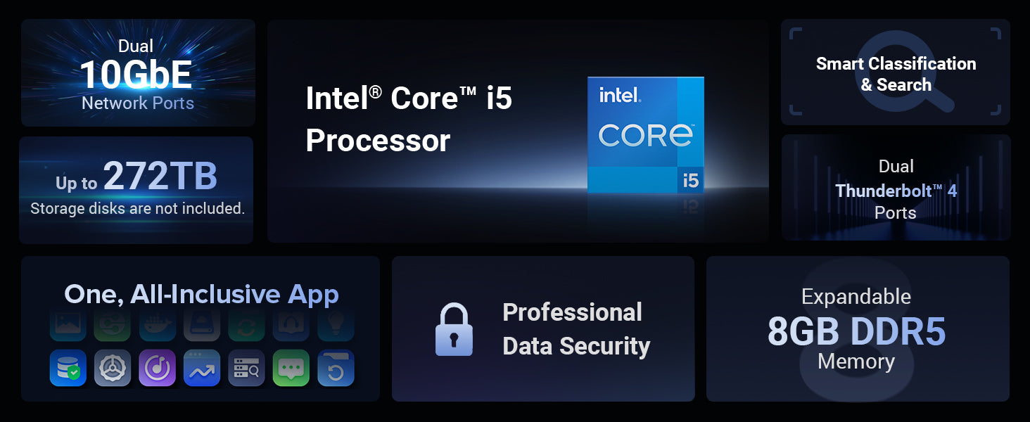 As the flagship model of the DXP series, it combines 8 drive bays with M.2 NVMe support, dual 10GbE networking, Thunderbolt 4 connectivity, a high-performance Intel Core processor, and full support for virtual machines and Docker. This combination allows the DXP8800 Plus to serve as an all-in-one solution for large media libraries, high-speed editing workflows, virtualization, and collaborative use—capabilities that entry-level NAS models cannot provide.