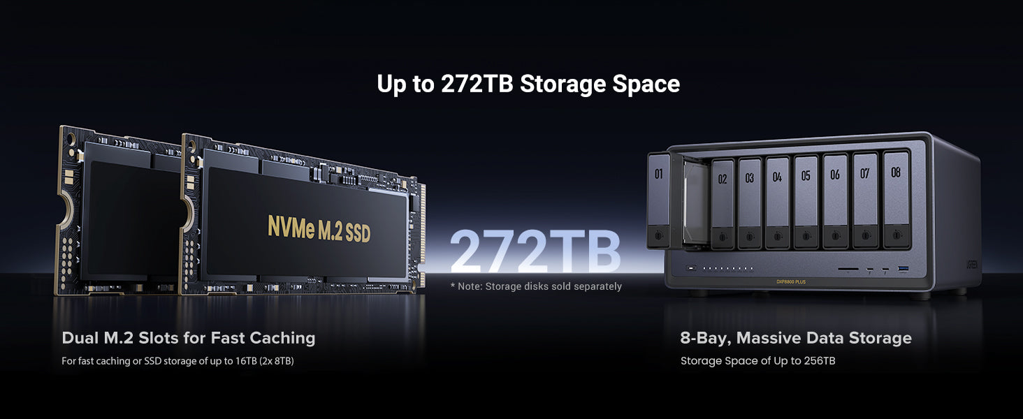 - 8-Bay, 272TB Massive Data Storage: Equipped with eight SATA and two M.2 NVMe drive bays, the NASync DXP8800 Plus has a maximum storage capacity of up to 272TB. And supports JBOD/Basic/RAID0/RAID1/RAID5/RAID6/RAID10 RAID levels. Store thousands of HD movies, pictures, and documents, Making NASync a movie library, photo album, and file storage space all in one.