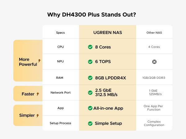 UGREEN NASync DH4300 Plus is an entry-level 4-bay NAS that's ideal for home media and vast private storage you can access from anywhere. Supports Docker but not virtual machines.