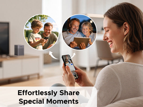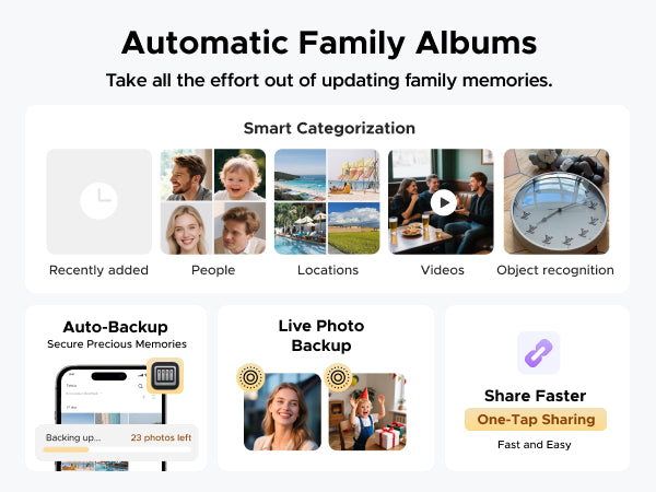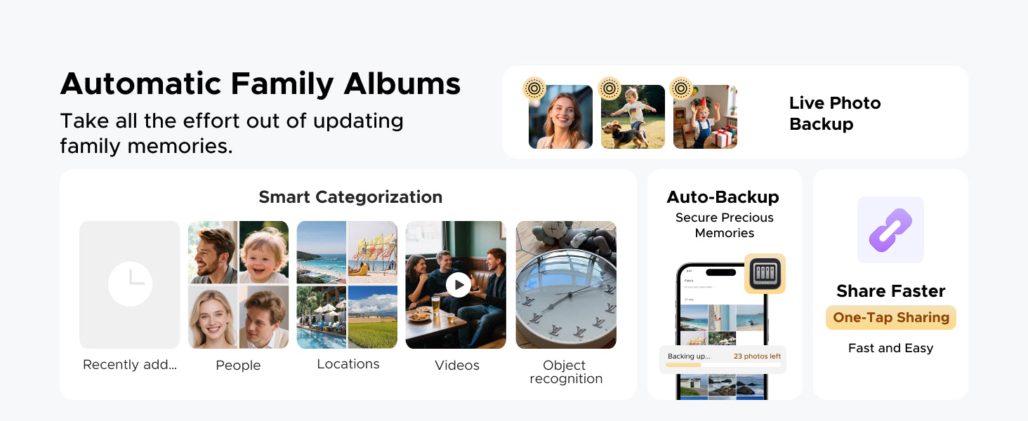 • photos by faces, scenes, and places, removes duplicates, and creates personalized baby growth albums – effortlessly preserving all precious moments and enabling easy sharing with family via QR code or link.