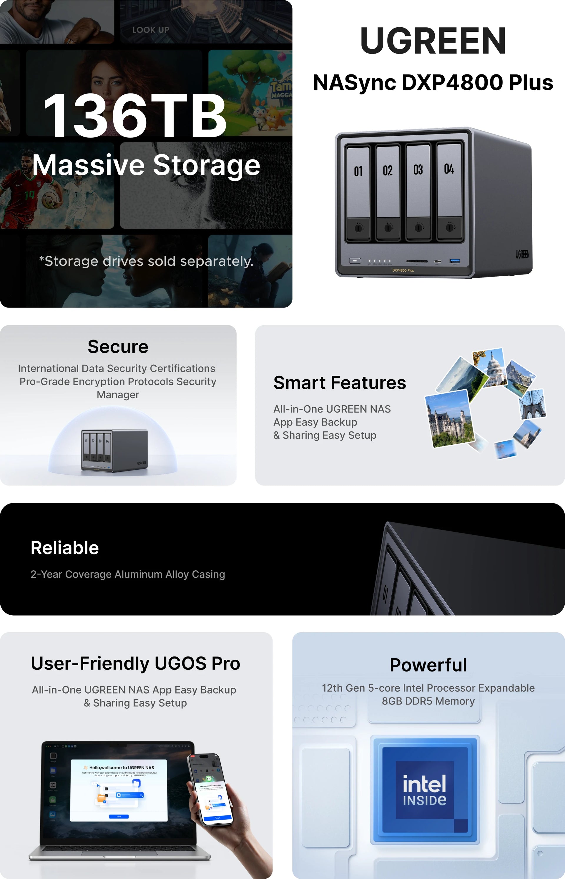 UGREEN NASync DXP4800 Plus is a flagship 4-bay NAS powered by a high-performance Intel processor. Delivers smooth performance for running virtual machines, Docker containers, and demanding workloads.