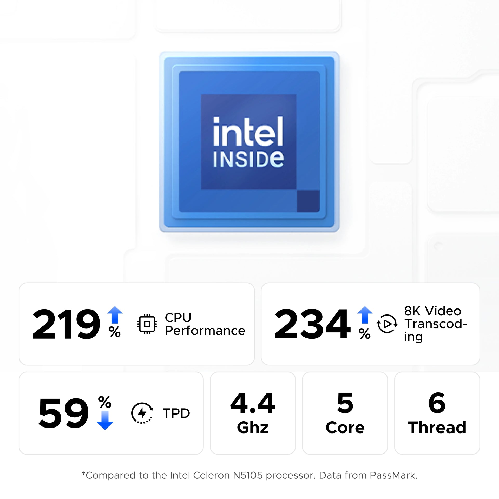 The 12th Gen Intel Pentium Gold Processor 8505 offers robust performance for 4K streaming, multi-user access, and fast backups, all while maintaining low power consumption.
