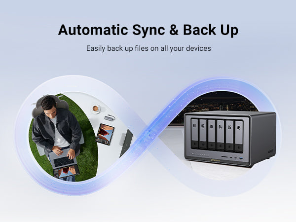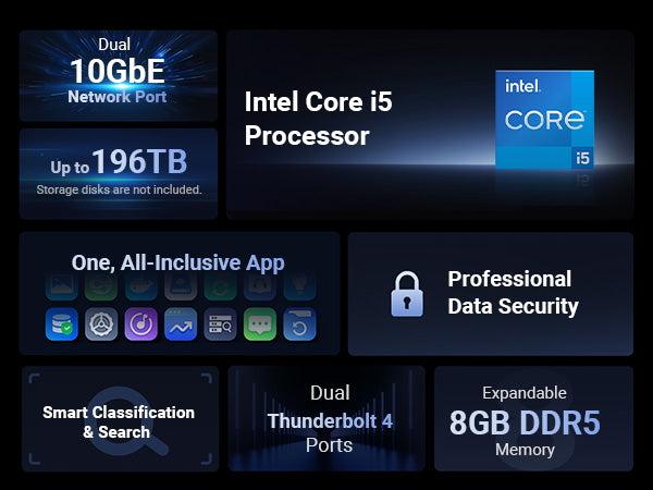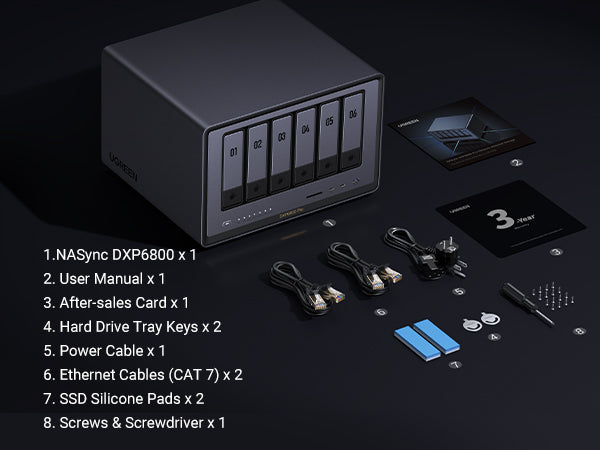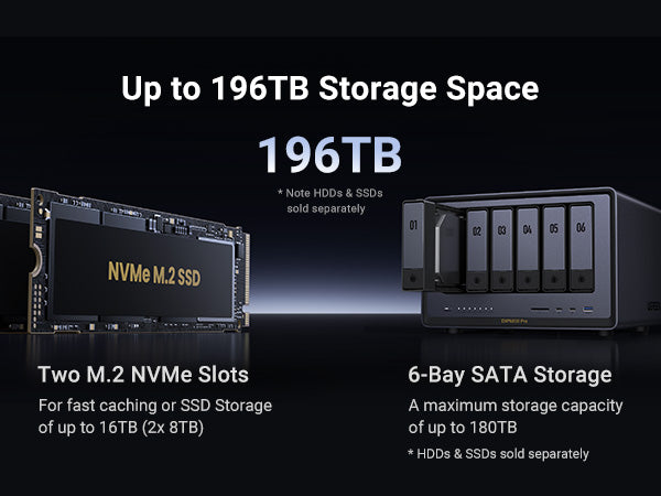 • 6-Bay, 196TB Massive Data Storage: Equipped with six SATA and two M.2 NVMe drive bays, the NASync DXP6800 Pro has a maximum storage capacity of up to 196TB. And supports JBOD/Basic/RAID0/RAID1/RAID5/RAID6/RAID10 RAID levels. Store thousands of HD movies, pictures, and documents, Making NASync a movie library, photo album, and file storage space all in one.